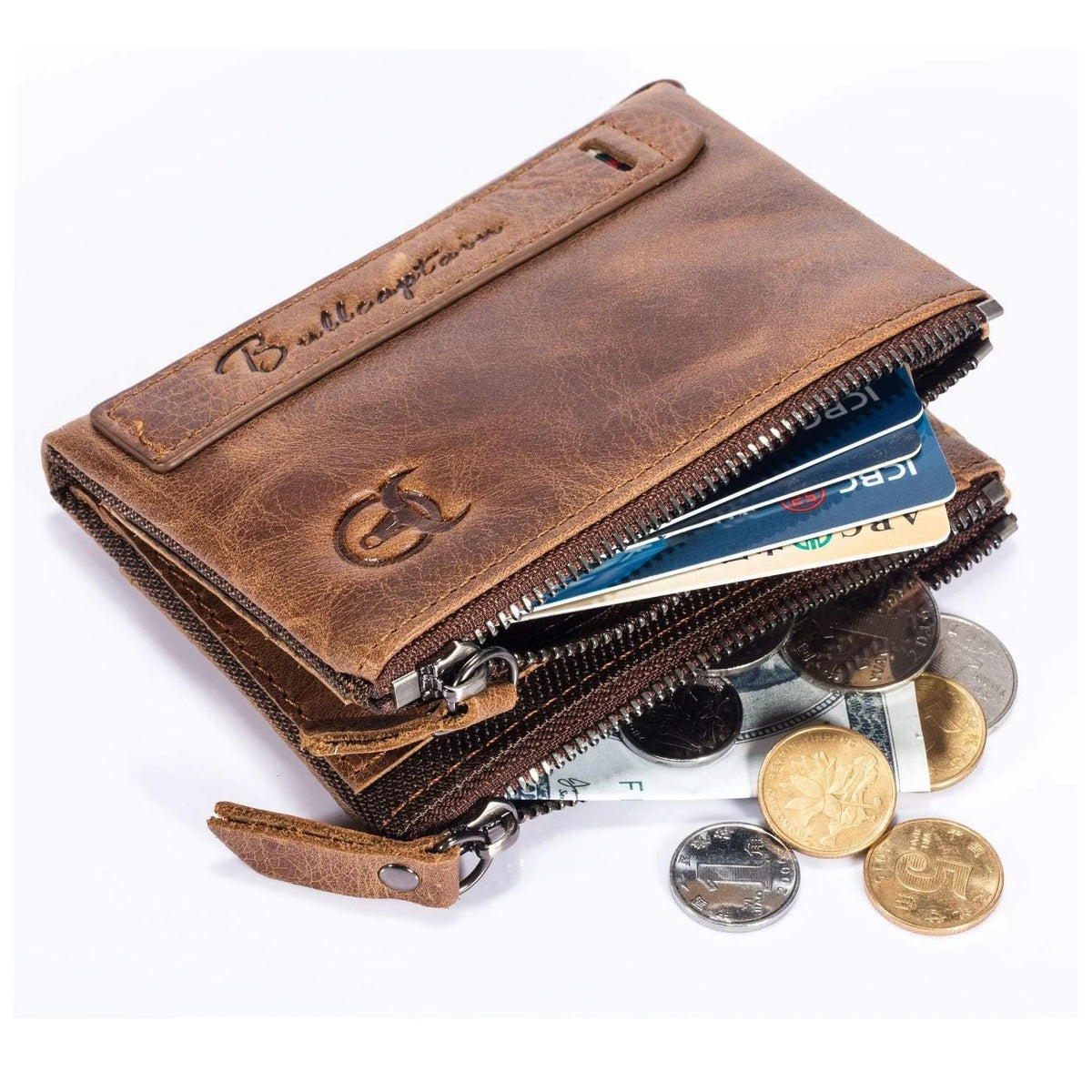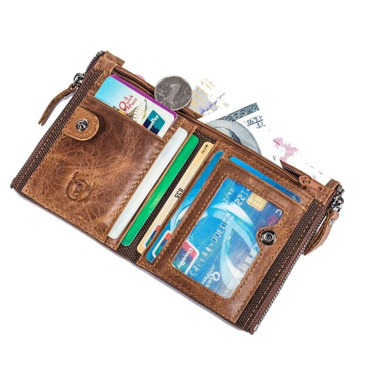 Genuine Leather Men’s Bifold Wallet with Double Zipper Pockets