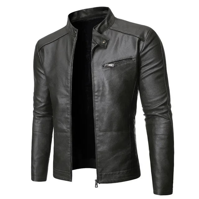 Menās Stand Collar Leather Motorcycle Jacket Warm Winter Coat