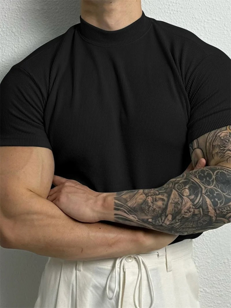 Elevate your casual wardrobe with this men’s slim-fit striped T-shirt. Designed with a small high collar and breathable fabric, it blends fashion with functionality. Perfect for spring and summer, this short-sleeve shirt is ideal for workouts, casual outings, or sportswear.
