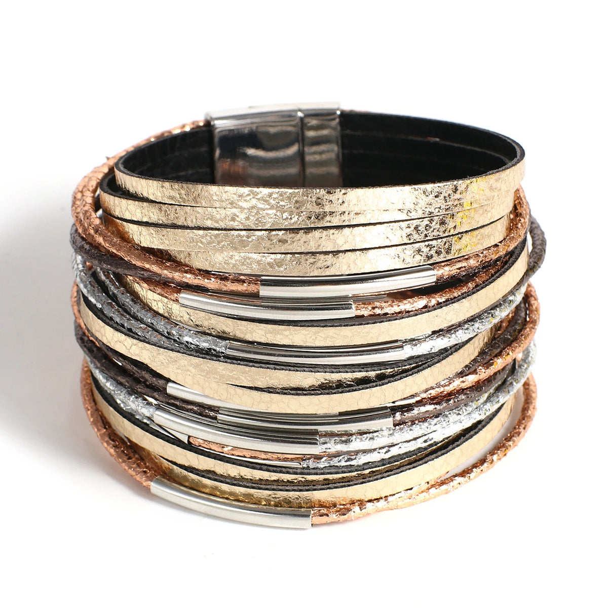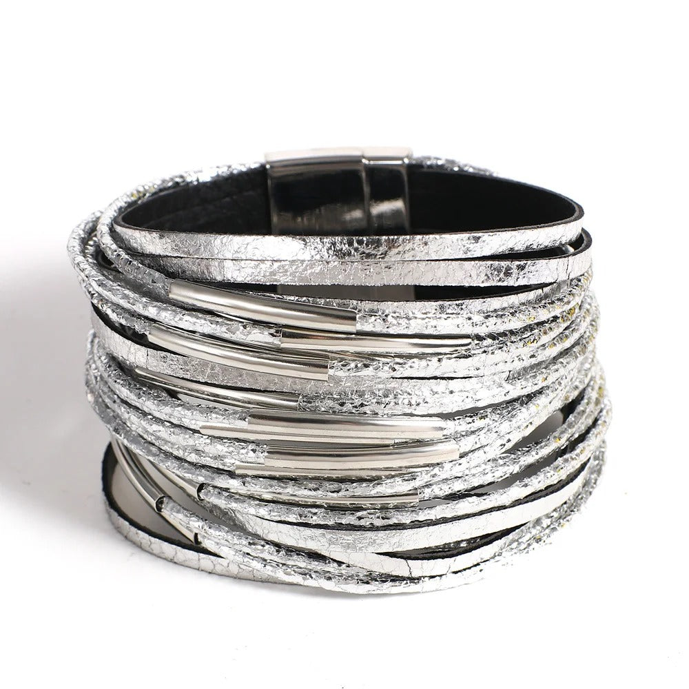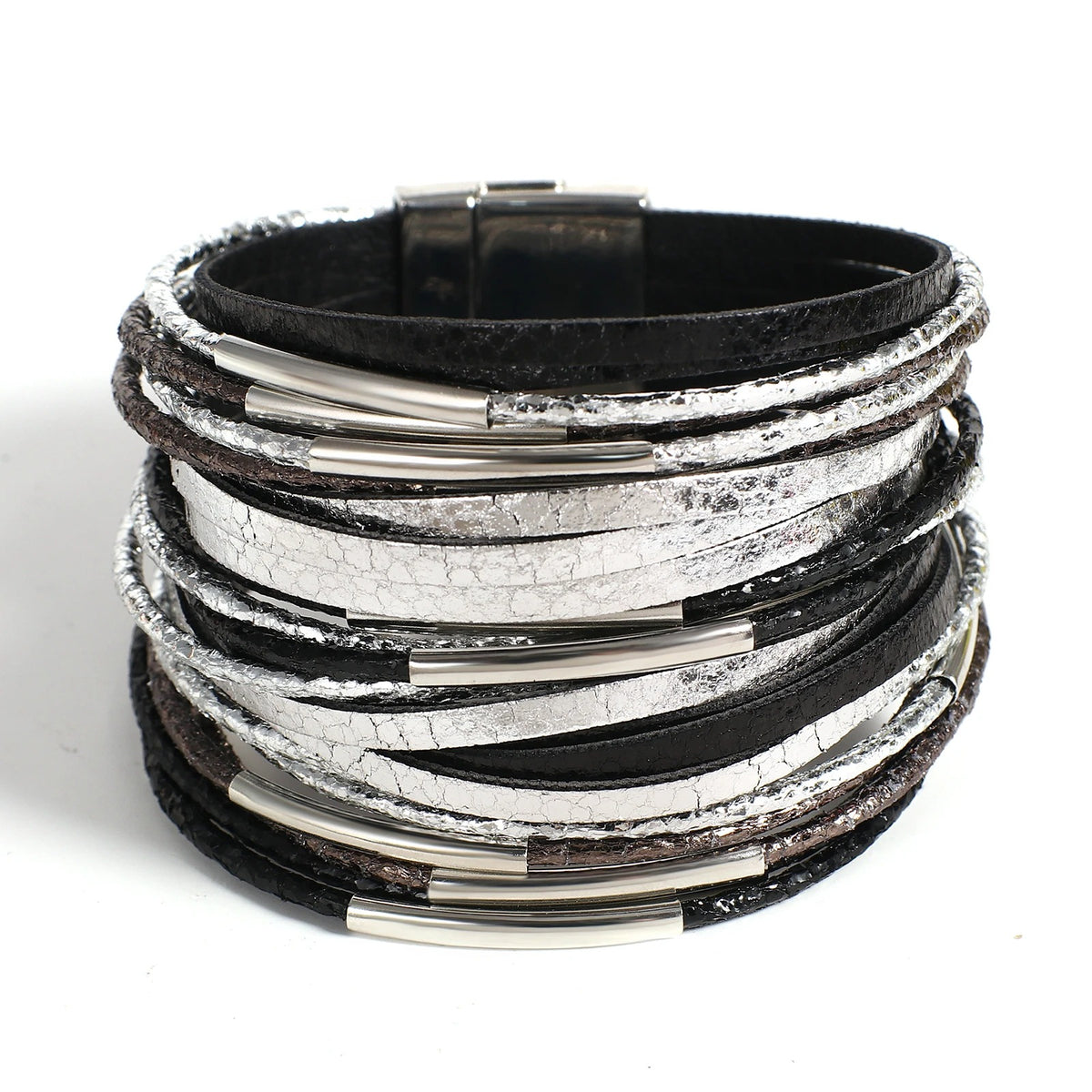 The wide multilayer wrap design combines comfort with durability, while the stylish metal tube details create a fashionable, eye-catching accessory. Perfect for parties, everyday wear, or as a unique gift, this bracelet suits both women and men who love standout jewelry.